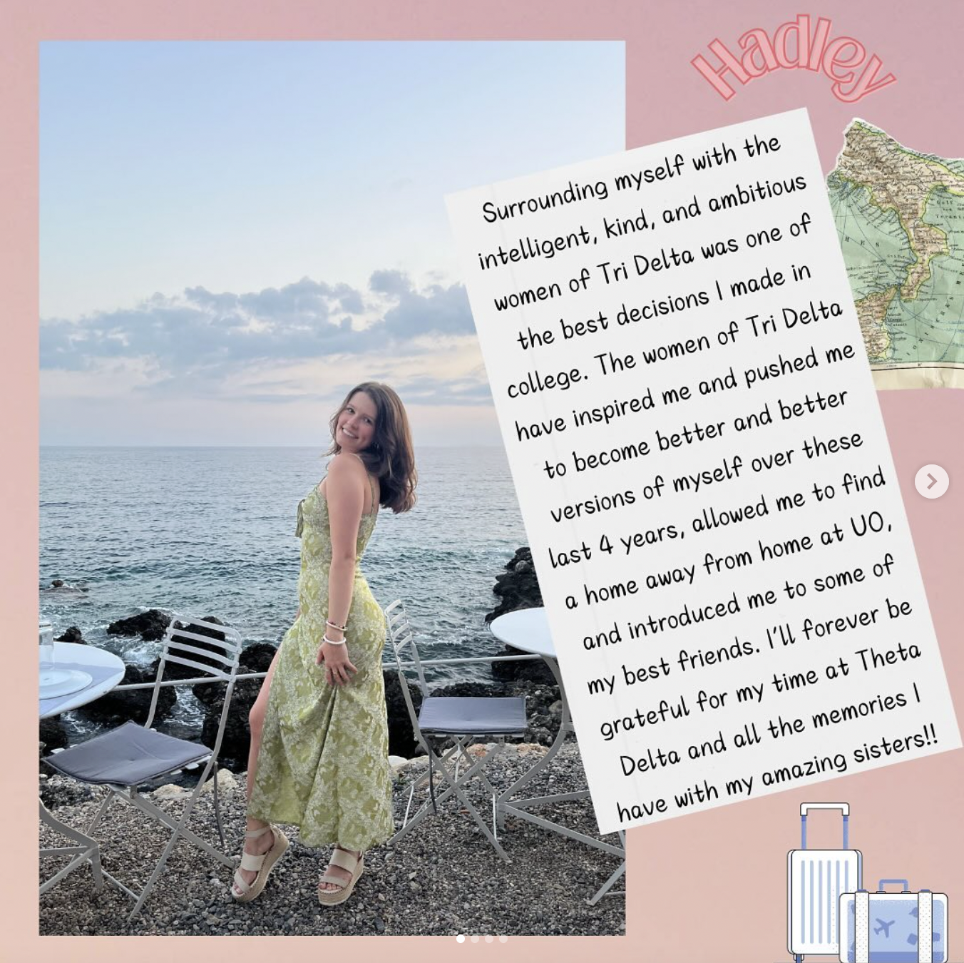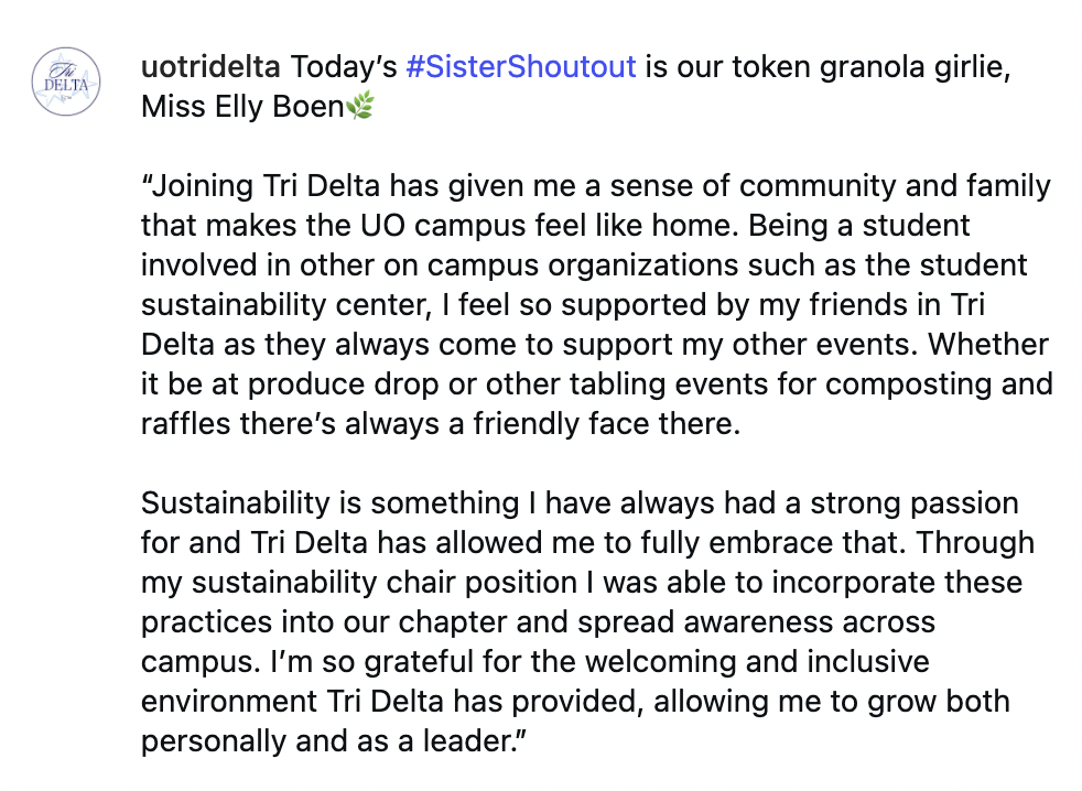 I highlighted members that were involved in extracurriculars outside of Tri Delta, like our student athletes and those involved in clubs outside of Greek Life. I wanted their quotes to include how the chapter supports those commitments rather than competes with them.