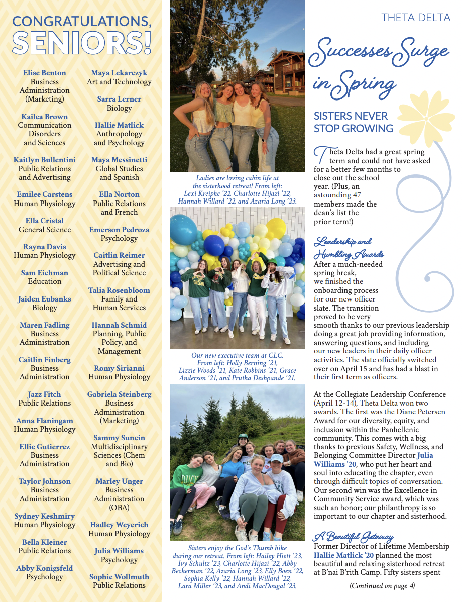 Another key responsibility I had as Director of PR&M was writing our chapter’s Alumni Newsletter each term. I collaborated with a national Tri Delta executive who handled the design and distribution, while I developed the body copy and gathered photos and quotes that highlighted the quarter’s biggest moments. Above is the newsletter I helped create for spring term of 2024!